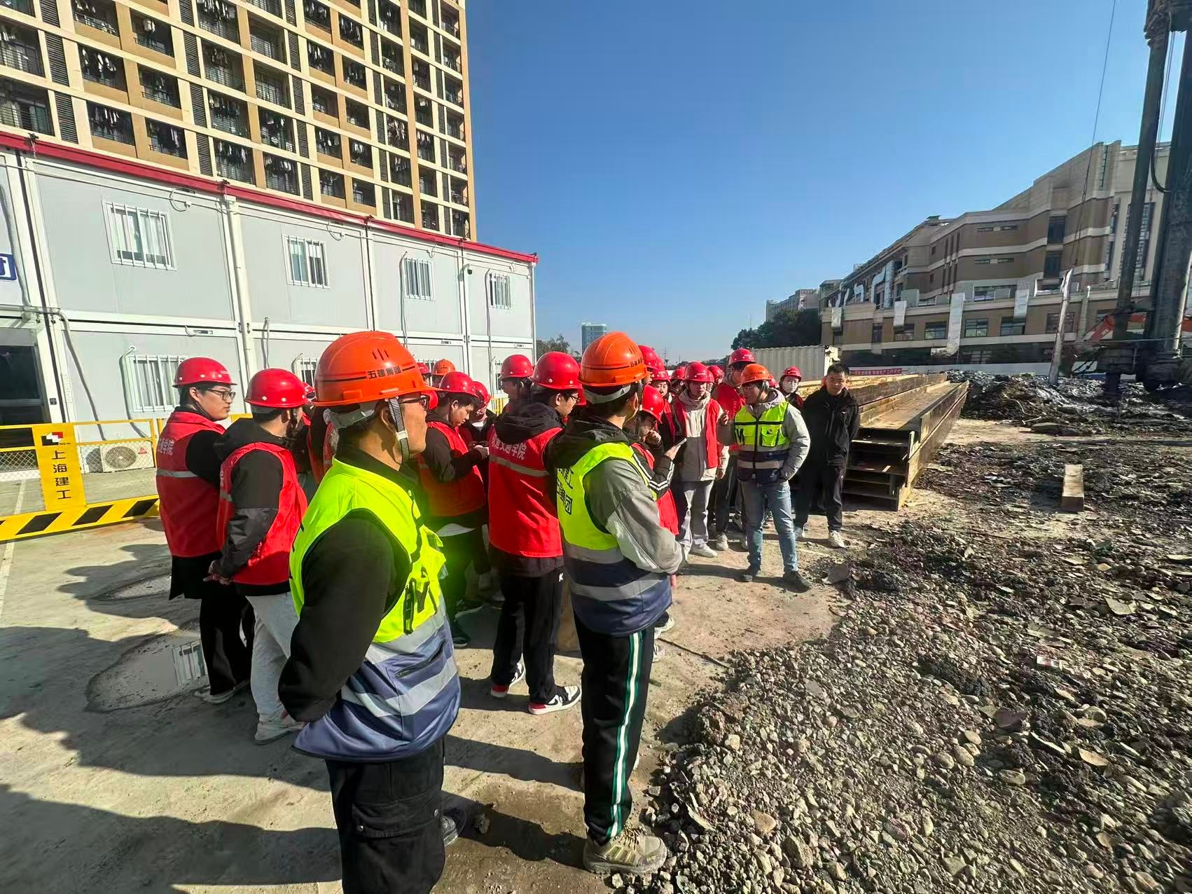 为保障活动有序开展,学校基建处联动项目承建单位,统筹协调各项事宜。双方多次沟通明确参观区域、制定安全预案,安排经验丰富的工程师担任现场讲师。参观中,项目部工程师结合工程实际,详细讲解桩基础施工、基坑围护、现场管理流程等核心技术。
